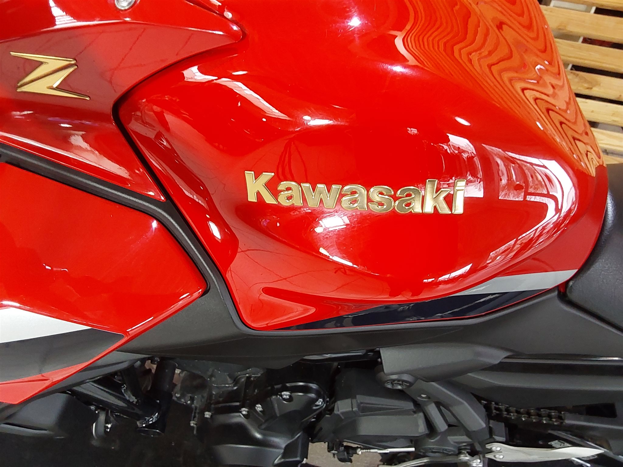 "Z"-Emblem und das Kawasaki-Logo sind in Gold ausgeführt. Hinzu kommen rote